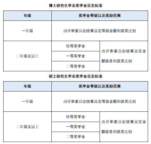 研究生学业奖学金等级设定与金额标准如下表所示: