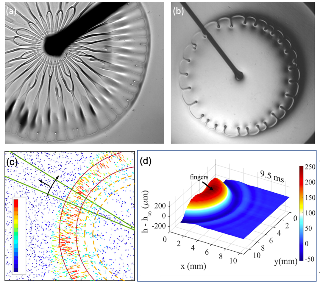 。进而利用粘弹性流体,通过多种实验表征手段对不稳定现象进行三维的描绘,使用颗粒示踪法(PTV)描述铺展过程中移动接触线附近的速度场,通过分析颗粒的密度分布估算其残留液膜的厚度。通过透射点阵光学折射法分析界面扰动,其高度扰动结果与颗粒示踪法估算的液膜厚度扰动一致。