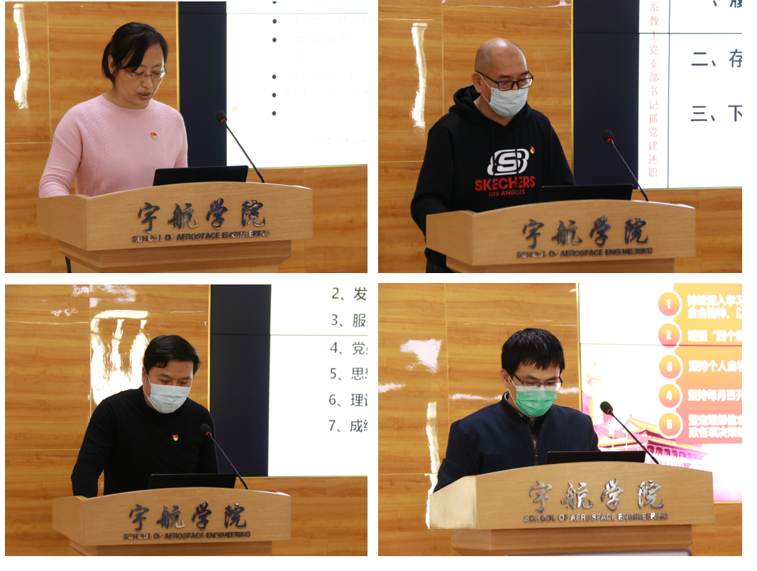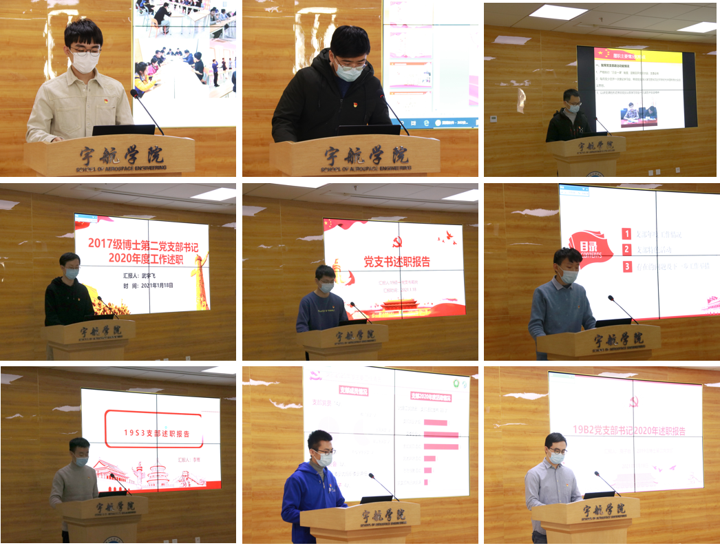 30位党支部书记均提交了书面述职报告,4位教工党支部书记和9位学生党支部书记进行了现场述职,依次从发挥党支部政治功能情况、在疫情防控中发挥党支部战斗堡垒作用和党员先锋模范作用情况、履行党支部述职职责和全面从严治党主体责任情况、党支部标准化规范化建设情况和成效、党员队伍建设情况、开展思想政治工作情况汇报了履职情况和特点,分析了存在的主要问题及原因,提出了下一步整改措施。参会人员对党支部书记述职情况进行了测评。