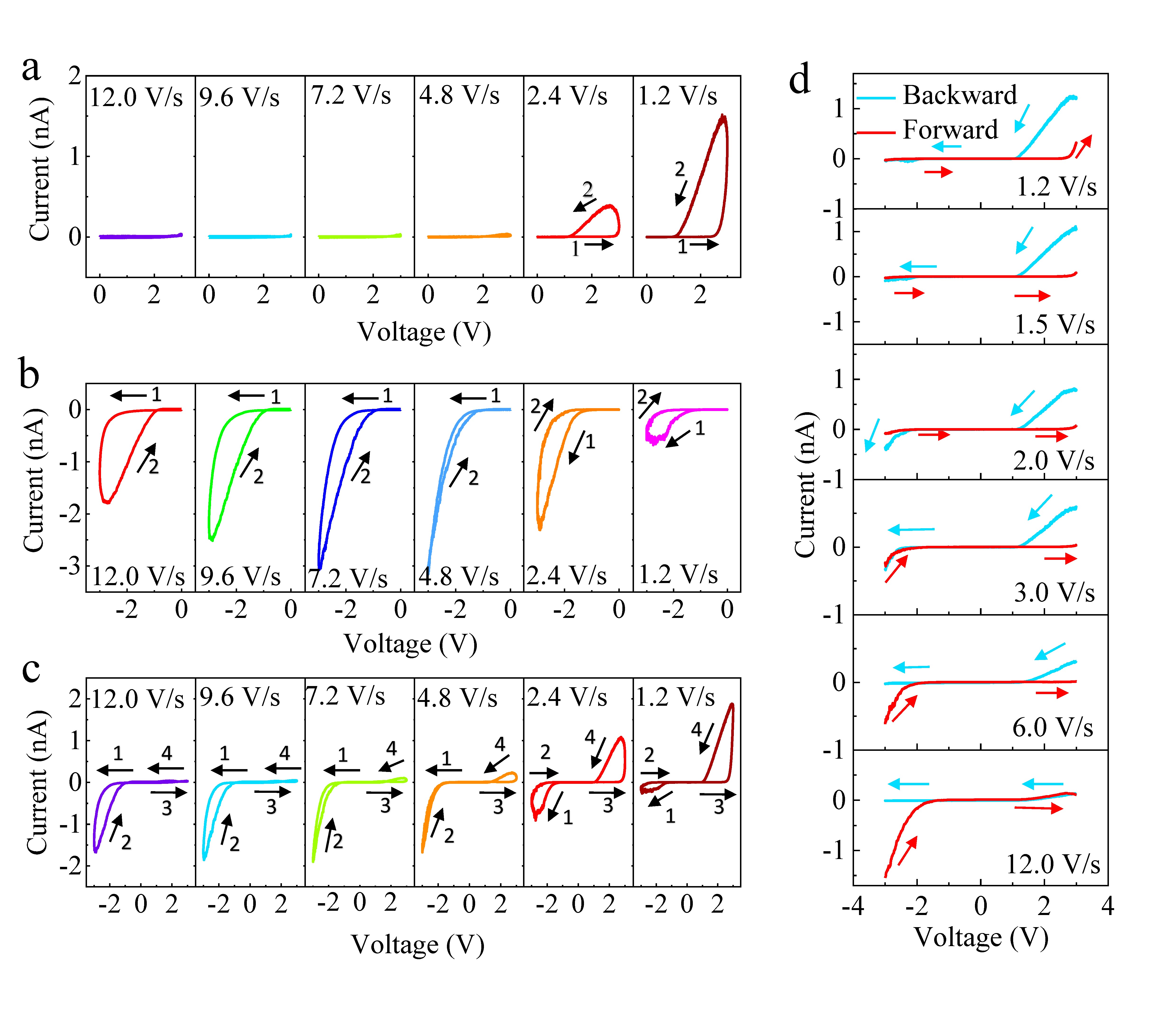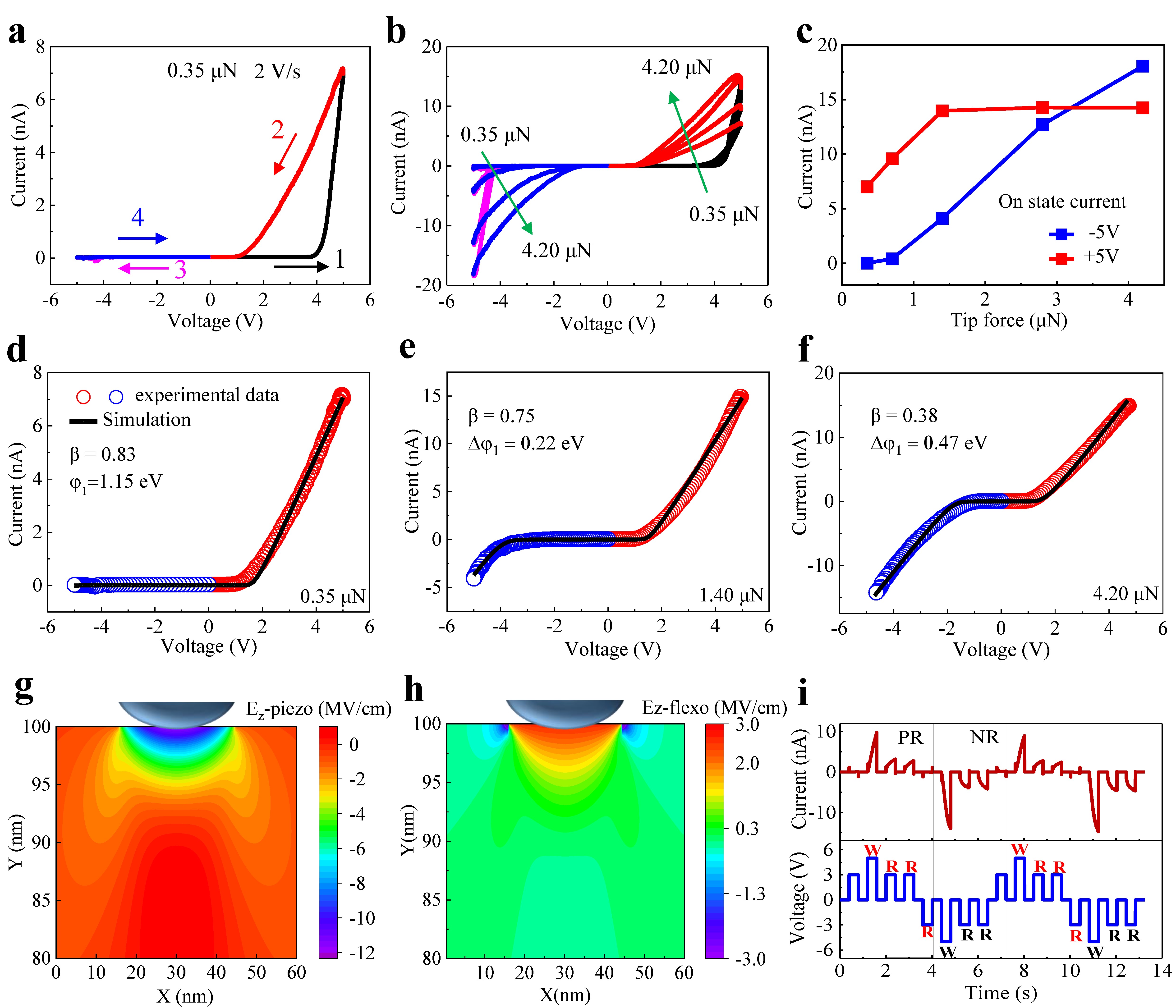 近年来,能感知外界复杂环境刺激的离子型忆阻器是神经网络学习领域的重要研究方向。其中的自整流性质须通过复杂的微纳加工/集成来实现,因此容易出现结构不兼容、整流方向不能灵活调控、无法应用于双向(正反电压)操作模式等问题。因此,迫切需要探索自身具有本征离子活性、电流整流方向灵活可调的单相离子型忆阻材料和调控方式。在此研究背景下,王学云与洪家旺课题组报道了在一种单相离子型忆阻材料CuInP2S6 (CIPS)中整流效应的力学与电学调制方式。通过原子力扫描探针技术在CIPS材料中观测到显著的Cu+离子迁移以及离子诱导的可调控自整流效应(如图1所示),并且通过改变扫描电压大小、速率、方向等方式,在Cu+离子的可控迁移和界面肖特基势垒的协同贡献下,实现了电流整流行为的连续调控。在此基础上,通过纳米探针施加局部的机械应变和应变梯度,诱导压电电场和挠曲电场调控界面肖特基势垒,进而实现了电流整流行为的力学连续可调(如图2所示)。该工作展示了范德瓦尔斯材料具有的电场和应变场调控的自整流特性,使该材料对外界动态复杂环境变化具有灵敏的识别能力,是未来智能忆阻器和神经网络学习的理想候选材料。