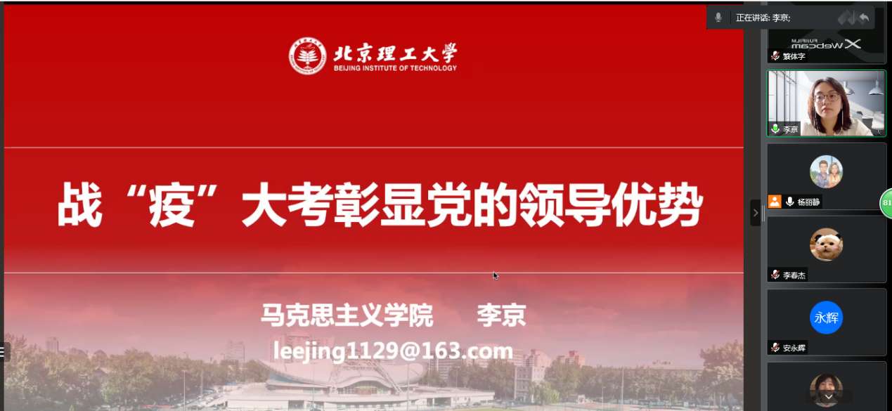 李京分析了疫情防控形势下社会面临的风险挑战,深入了解读了中华优秀传统文化与中国政治文化的独特性、中国共产党的制度优势和组织优势,引导师生党员在不确定的世界中寻找确定性与肯定性,坚定理想信念,践行初心使命,汇聚起同心抗"疫"的磅礴力量。