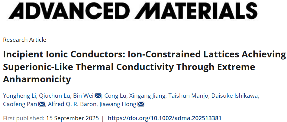 、临近空间环境特性及效应全国重点实验室洪家旺教授团队在离子导体的原子间非线性力研究中取得重要进展,相关成果以"Incipient Ionic Conductors: Ion-Constrained Lattices Achieving Superionic-Like Thermal Conductivity Through Extreme Anharmonicity"为题发表于国际期刊Advanced Materials。该团队针对超离子导体作为热电材料时由于高离子迁移率易引发金属沉积的问题,引入"初生离子导体"的概念(具有离子传导初始特征但未达到完全离子导体水平),发现金属卤化物(AX)x–(MX)1−x体系(A=Cu/Ag,M=K/Rb/Cs,X=Cl/Br/I)相比于超离子导体,稳定性更高并且保持低热导率(κ)。以CsCu2I3为典型,借助同步辐射实验和第一性原理计算,证实了Cu离子在CuI4四面体间呈现受限迁移。依靠大科学装置进行的非弹性X射线测试,结合理论计算表明该材料原子间存在强非线性力的作用(强非谐效应),这使得材料在一个方向出现极低的玻璃状热导率。研究发现,离子迁移率与热导率没有直接关联,初生离子导体的热导率与超离子导体相当,但稳定性更优。该研究为开发基于初生离子导体的超低热导-高稳定热电材料提供了依据。